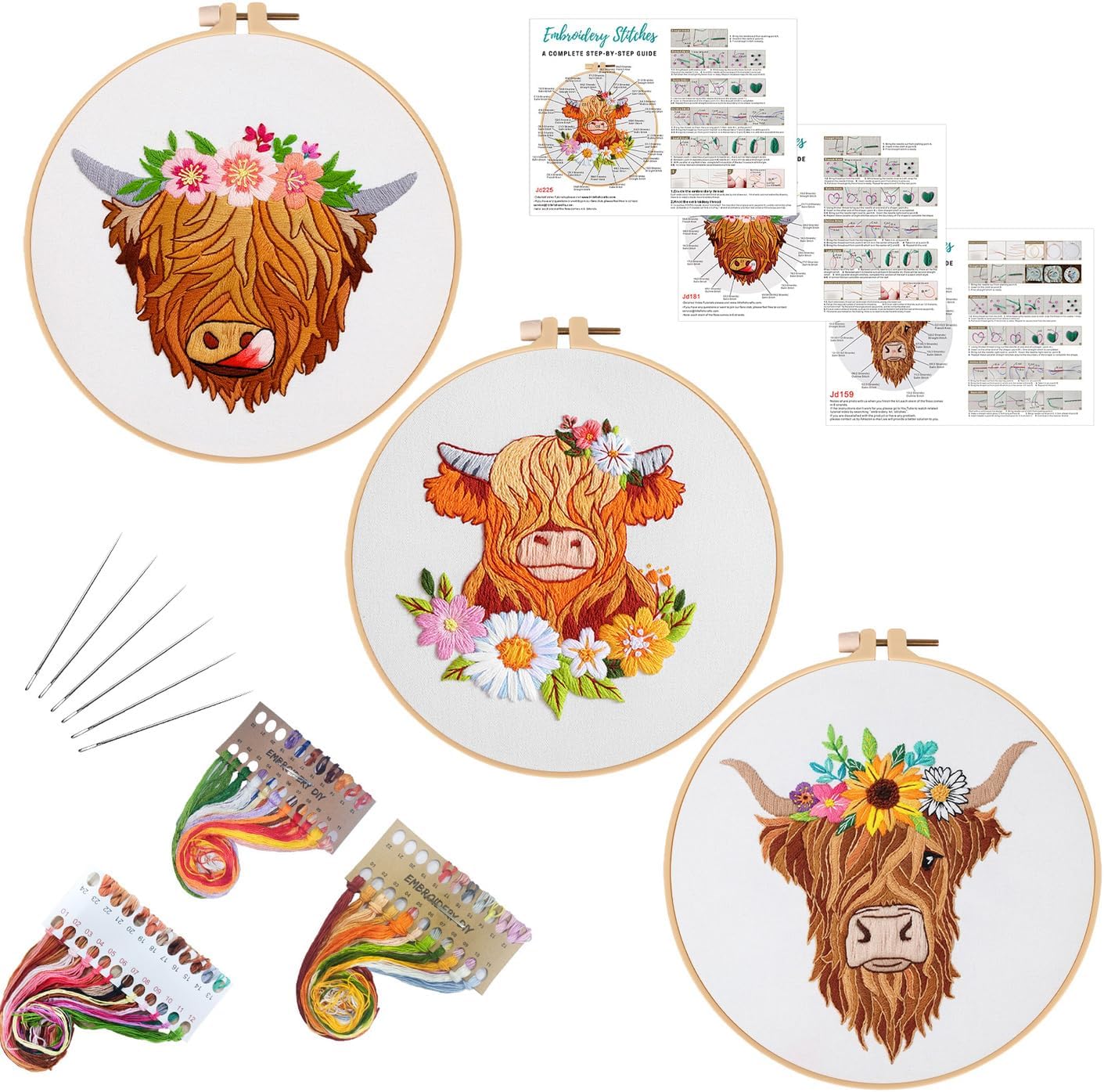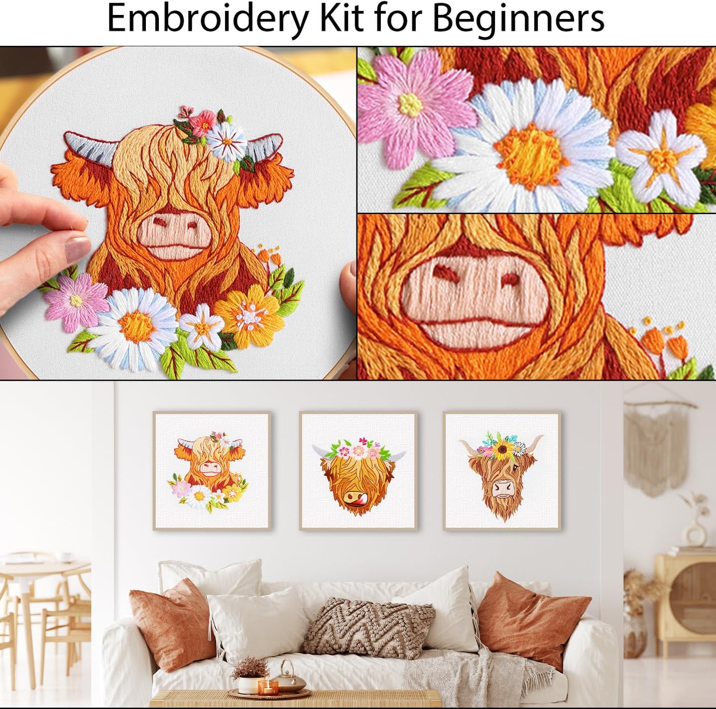 Louise Maelys 3 Sets Highland Cow Embroidery Kits for Beginners,Cross Stitch Kit for Adults,Starters DIY Needlepoint Including Embroidery Hoop Cloth Needles Instruction and Threads